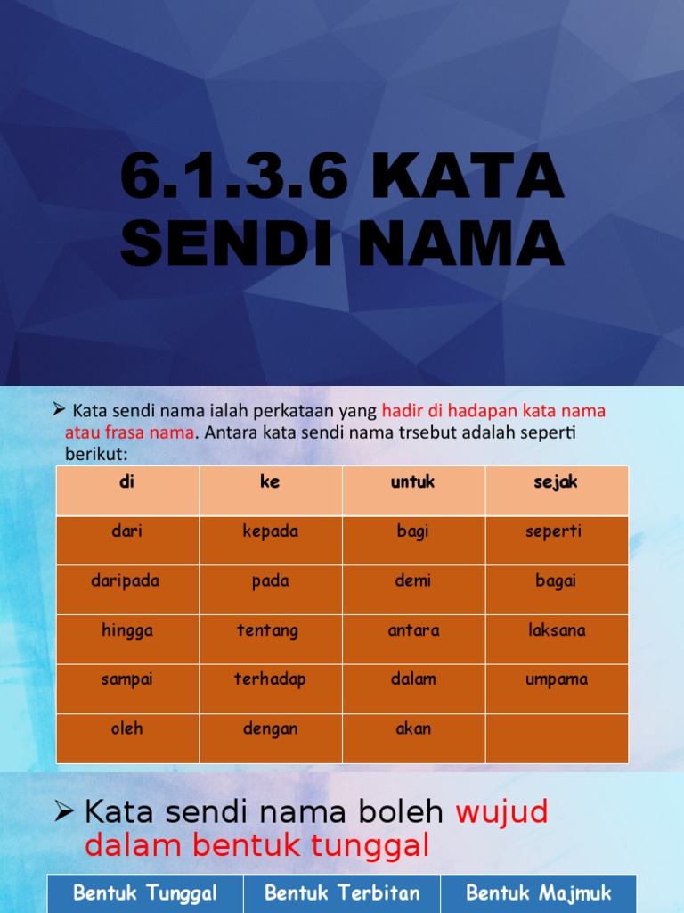 Kata Sendi Nama ialah kata yang digunakan untuk menyambung frasa nama dengan kata atau frasa-frasa dan ayat. SOALAN TATABAHASA SPM 2016 KBAT. Semoga bahan-bahan berkenaan dapat membantu pelajar menjalankan tugasan dan sumber untuk mendapatkan maklumat bahasa.